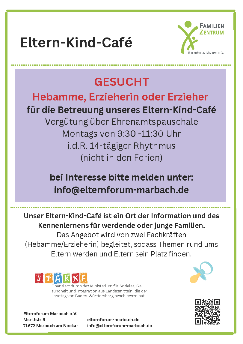 Der “Elternforum Marbach e.V.” ist ein Zusammenschluss von ehrenamtlich engagierten Menschen jeden Alters, die sich für die Belange von Familien einsetzen. Wir verstehen uns als Plattform für den Austausch von Eltern, Großeltern und Betreuungspersonen, um gemeinsam Lösungen zu finden und Unterstützung zu bieten.